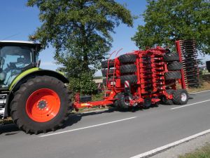 Kverneland U-drill, transported on road by tractor